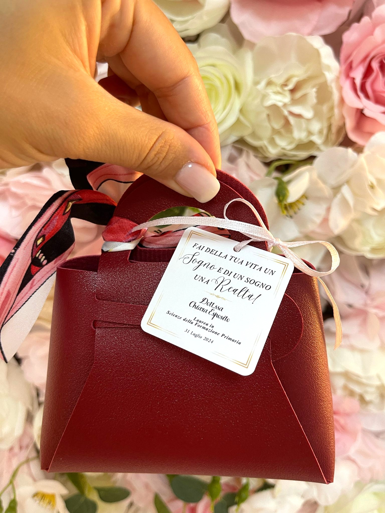 Borsetta in similpelle + sacchetto con 5 confetti.