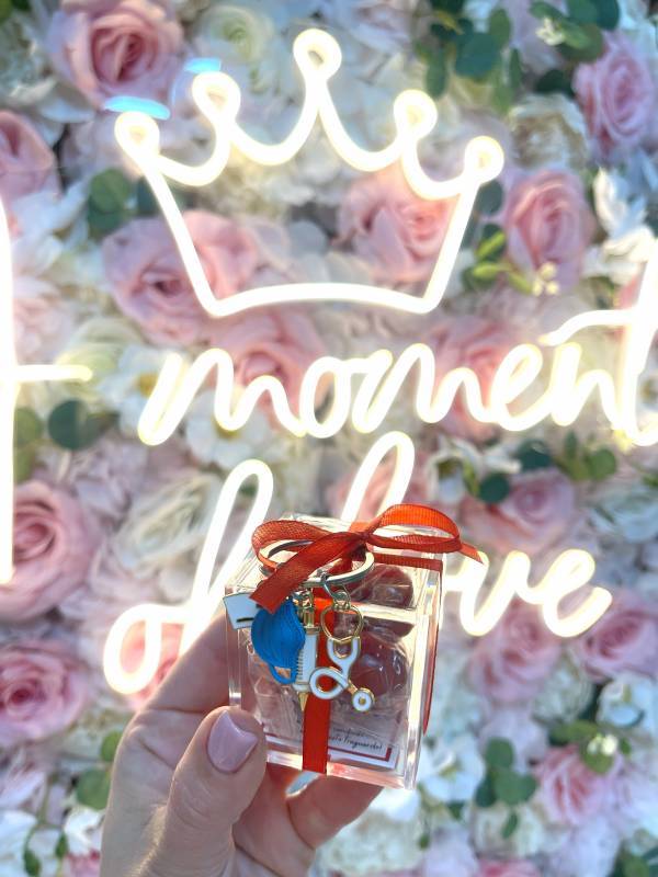 Scatolina in plexiglas trasparente con portachiavi colorazioni miste + 5 confetti