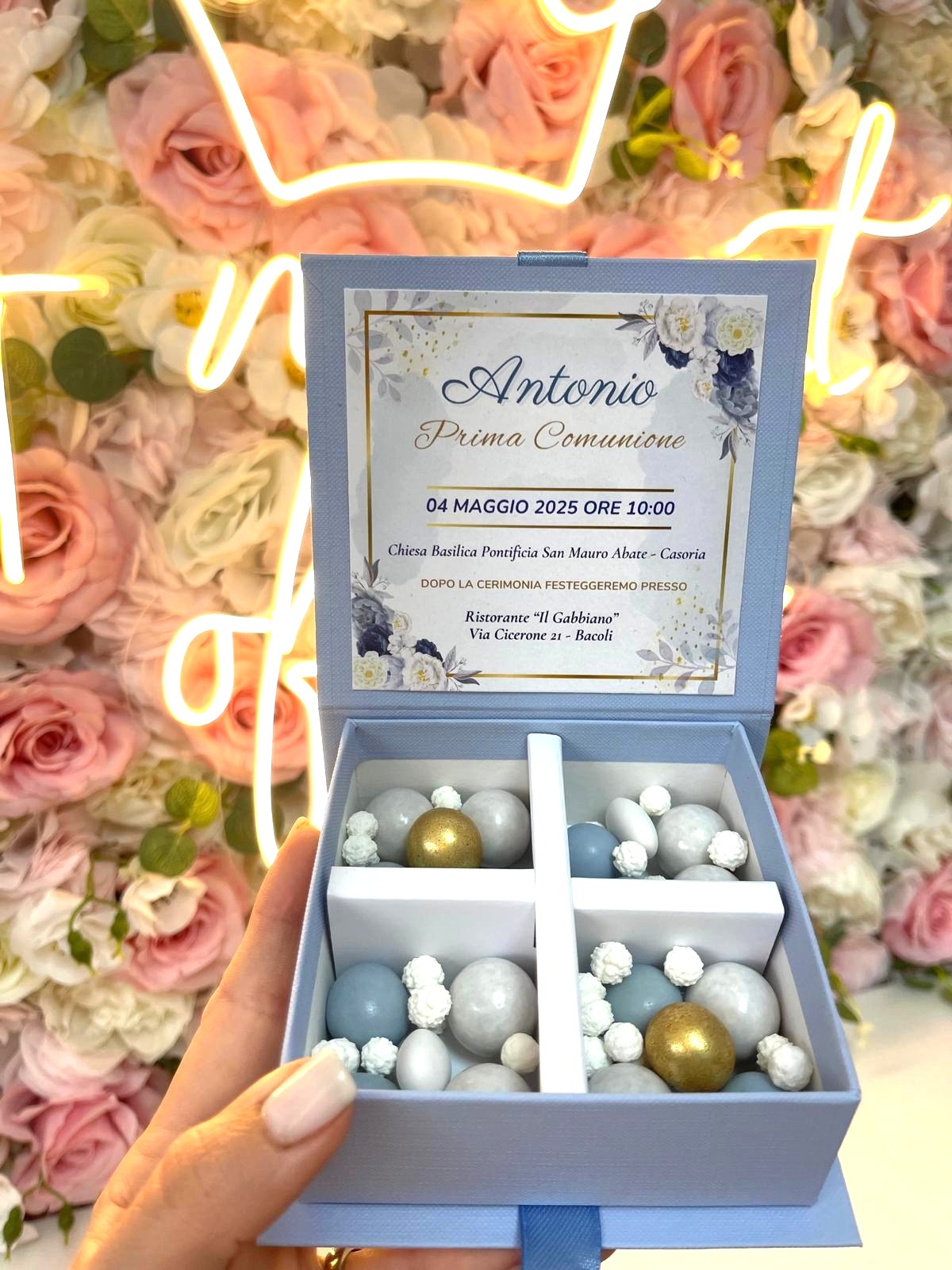 Scatolina degustazione in cartone rigido con fiocco e nome plexi esterno, apertura a libro con 4 scomparti interni + degustazione confetti