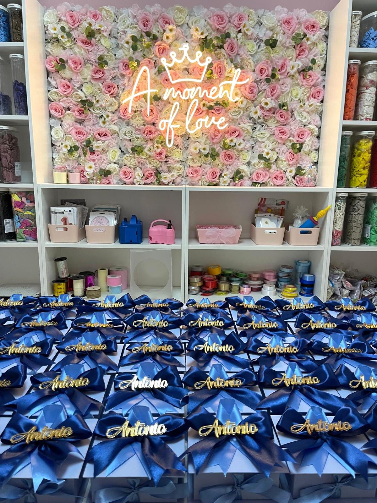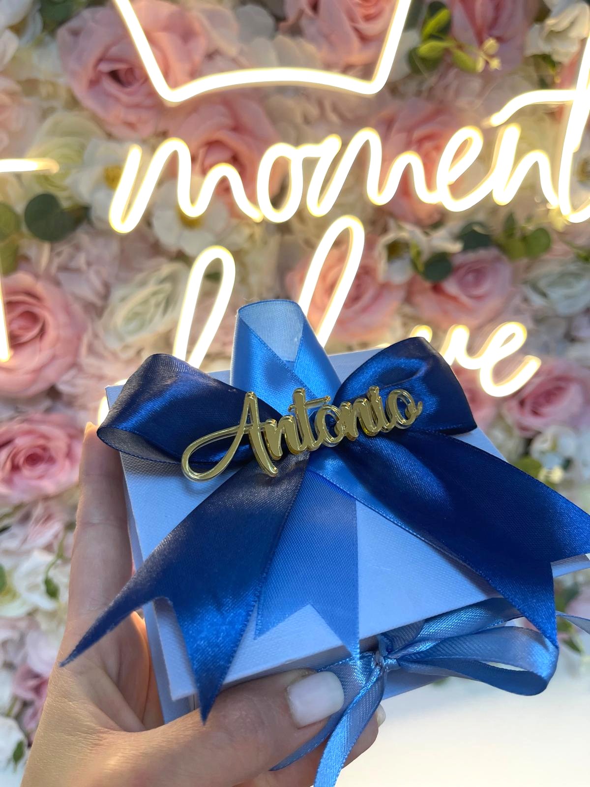 Scatolina degustazione in cartone rigido con fiocco e nome plexi esterno, apertura a libro con 4 scomparti interni + degustazione confetti