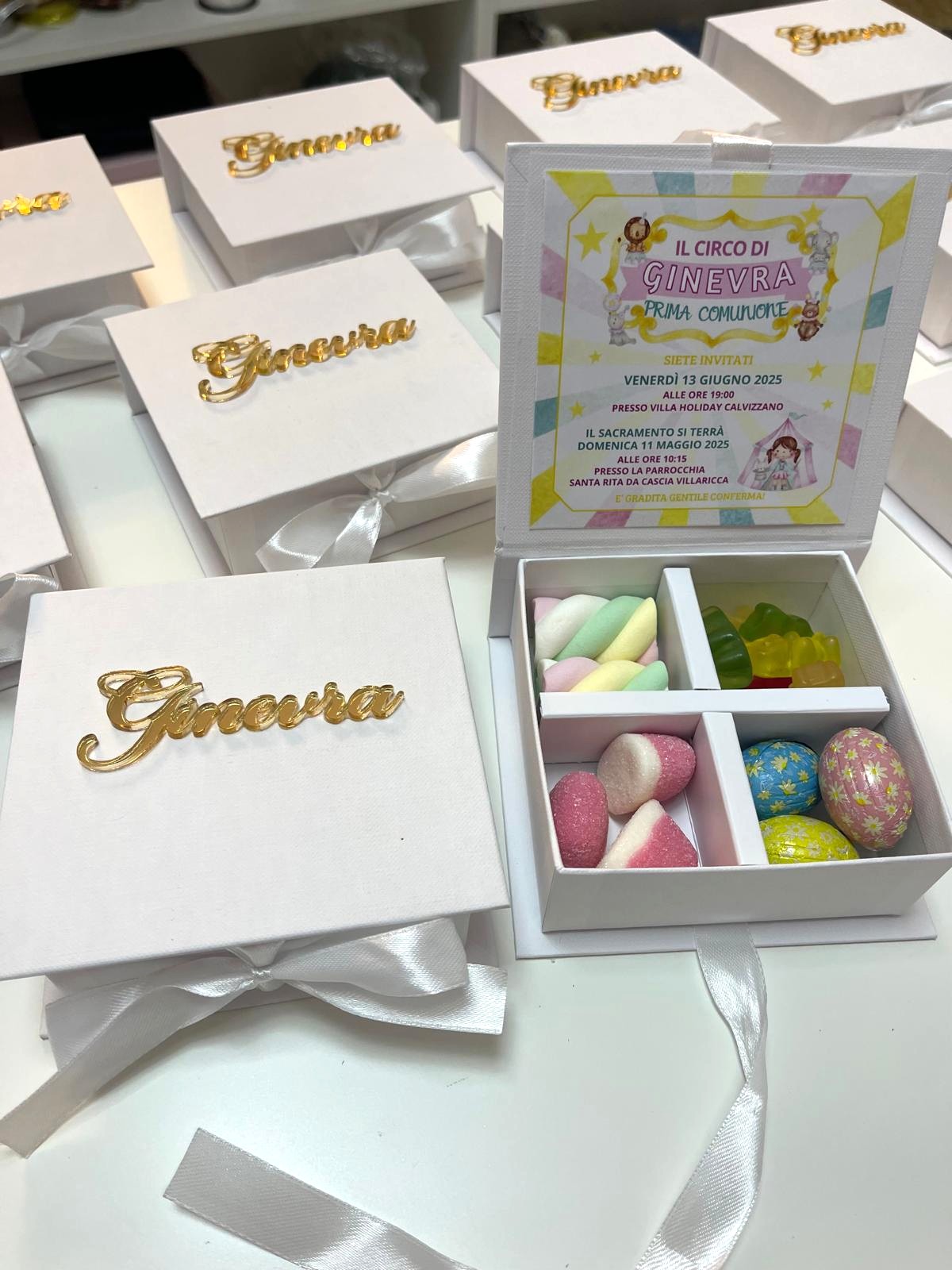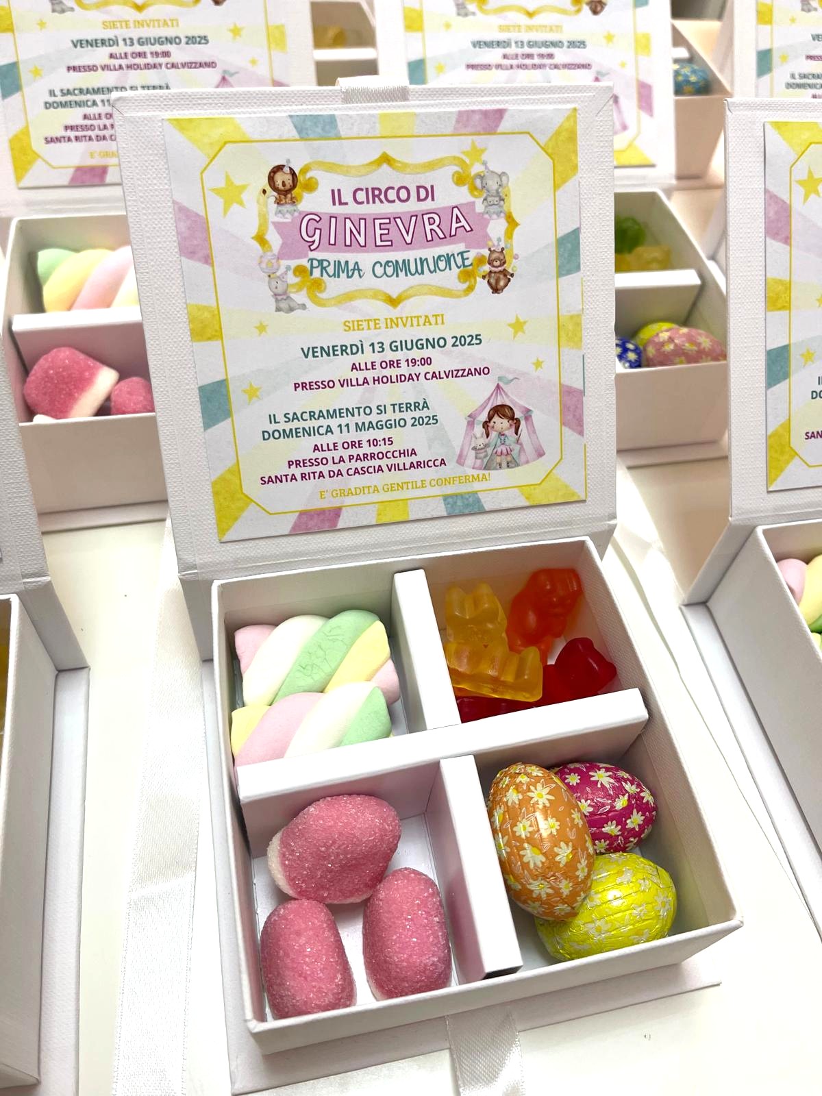 Le scatoline sono personalizzate con i dati del tuo evento.