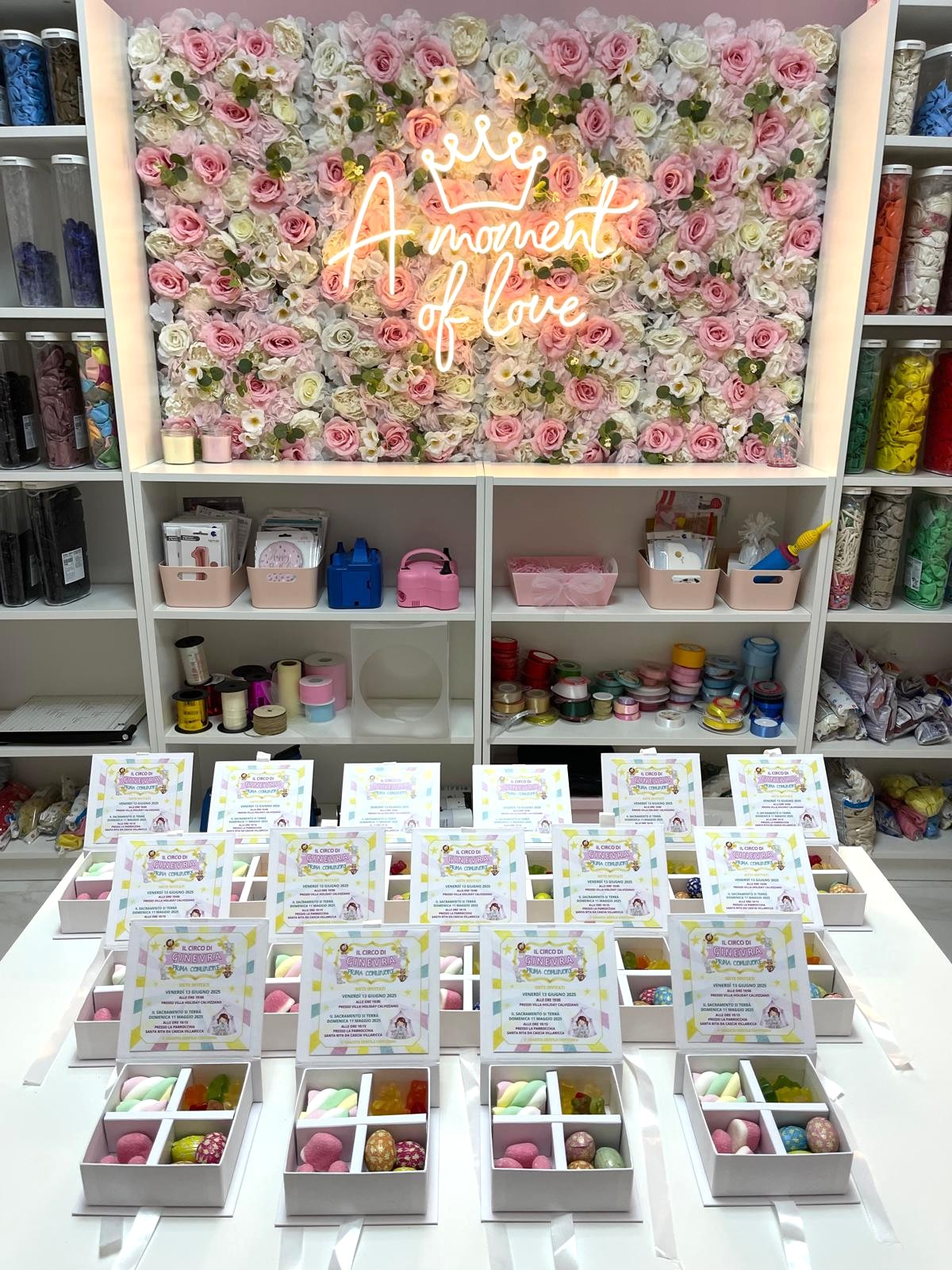 Scatolina degustazione in cartone rigido con plexi nome esterno, apertura a libro con 4 scomparti interni + degustazione confetti o caramelle (da specificare)