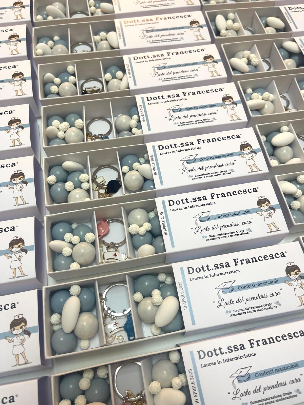 Se scegli l’opzione con degustazione confetti i gusti sono cioccolato, cereali, nocciola, mandorla mix bianchi e rossi.