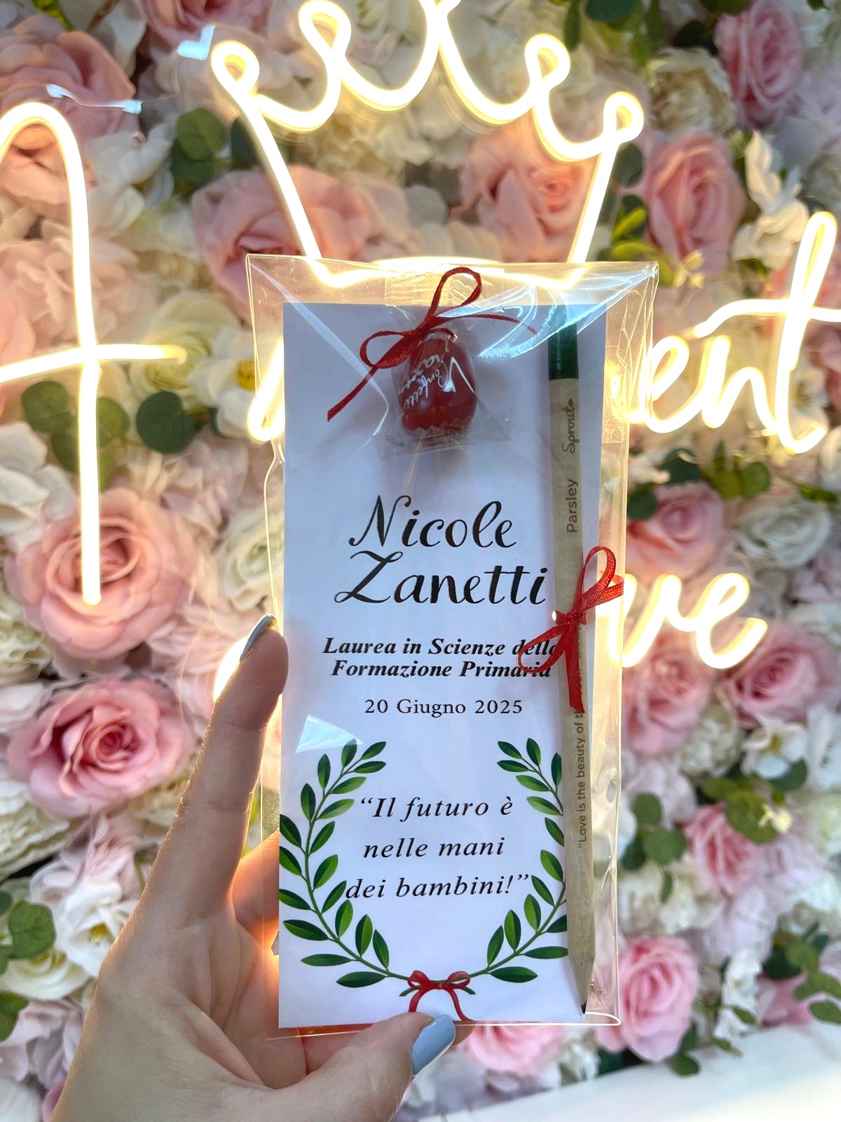 Segnalibro con matita piantabile + confetto + bustina trasparente esterna.